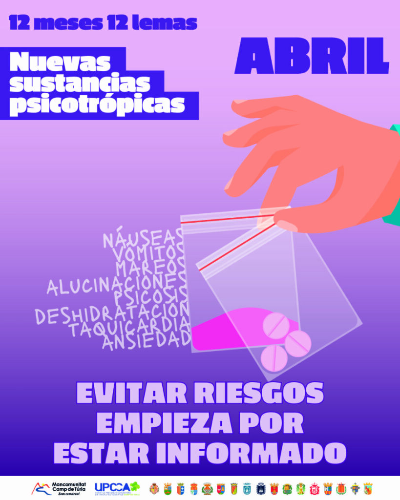 Este mes de abril, desde la UPCCA Camp de Túria quiere poner el foco en las nuevas sustancias psicotrópicas que han ido llegando a nuestro país en los últimos años y que suponen un peligro añadido a las ya existentes. El lema del mes de abril es “Evitar riesgos empieza por estar informado”.